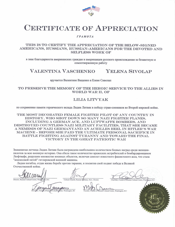 The prestigious Friends of the Russian Cultural Centre in Washington D.C. have officially recognized the contributions of my Call Sign, White Lily collaborators, Yelena Sivolap and Valentina Vaschenko, toward keeping the memory of this great young hero alive for future generations. Thought you might like to see the certificate of merit that will hang in the Lilia Litvyak Museum in Krasny Luch.