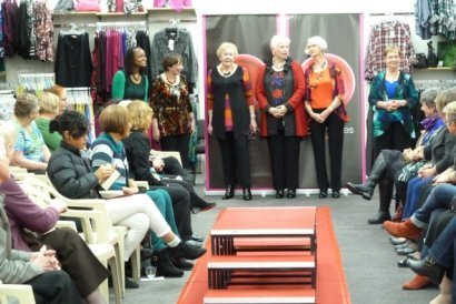 My service club, Soroptimist International, organises an annual fund-raising fashion parade with one of our local clothing stores, and Friday was the big day. Ballentynes of Kilbirnie have hosted us year after year. They let us use their big store after hours, set up a red carpet ‘runway’, tables for drinks and nibbles, chairs for as many people as we can safely cram into the store, and then give a generous discount on the clothing the guests buy over the following week. In return we provide ‘models’ of realistic proportions, the drinks and nibbles, and have a wonderful time. Here’s our intrepid modelling team.