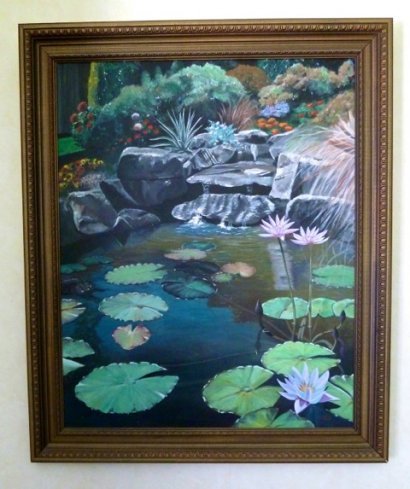 This is a pond and waterfall we built in our garden. Full of optimism I stocked the pond with tropical water lilies. Brilliant the first year (when I painted this.) Disappointing the second year. Dead the third year, because Wellington just isn’t warm enough to grow tropical water lilies. We now have nice ordinary white and red ones which are beautiful and dependable.