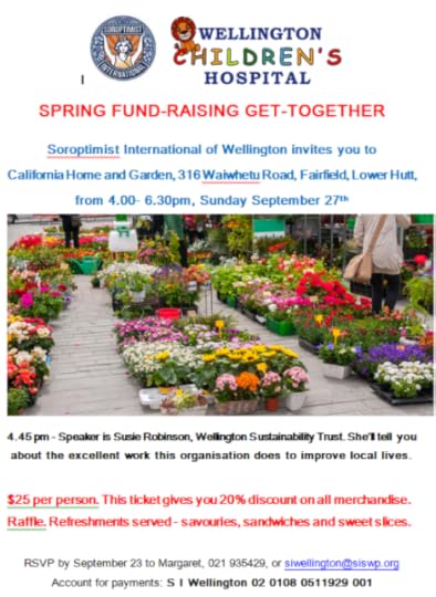 But they’re busy. Goodness, this has taken some doing, and I’m really quite pleased about it. These are not little old ladies who have drifted away from full-time employment to sit by the fire knitting. They’re all past or present members of Soroptimist International of Wellington - a lovely service club I’ve belonged to for more than thirty years now. We raise money for local, national and international projects – and our next effort is on behalf of the new Wellington Children’s Hospital. It's an after-hours get-together at a huge garden centre, with product discounts and a good interesting speaker. (Quick poster by me - there's always a job to be done.)