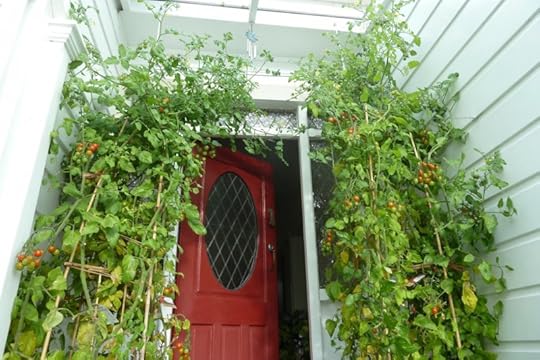 Actually we gossip online about all sorts of things, but around Halloween is traditionally outdoor tomato planting time in New Zealand, so here we go. This is our front porch in January. Some years it’s a fight to get inside.