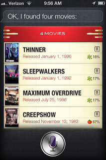 Hmm, seems Mr. King forgot to leave me his phone number. No problem. I figured since Siri is now a movie buff, I'd ask it to give me a list of movies involving Stephen King. Yes! I got some answers--well, a few at least. For some reason, I'd thought there'd be more.