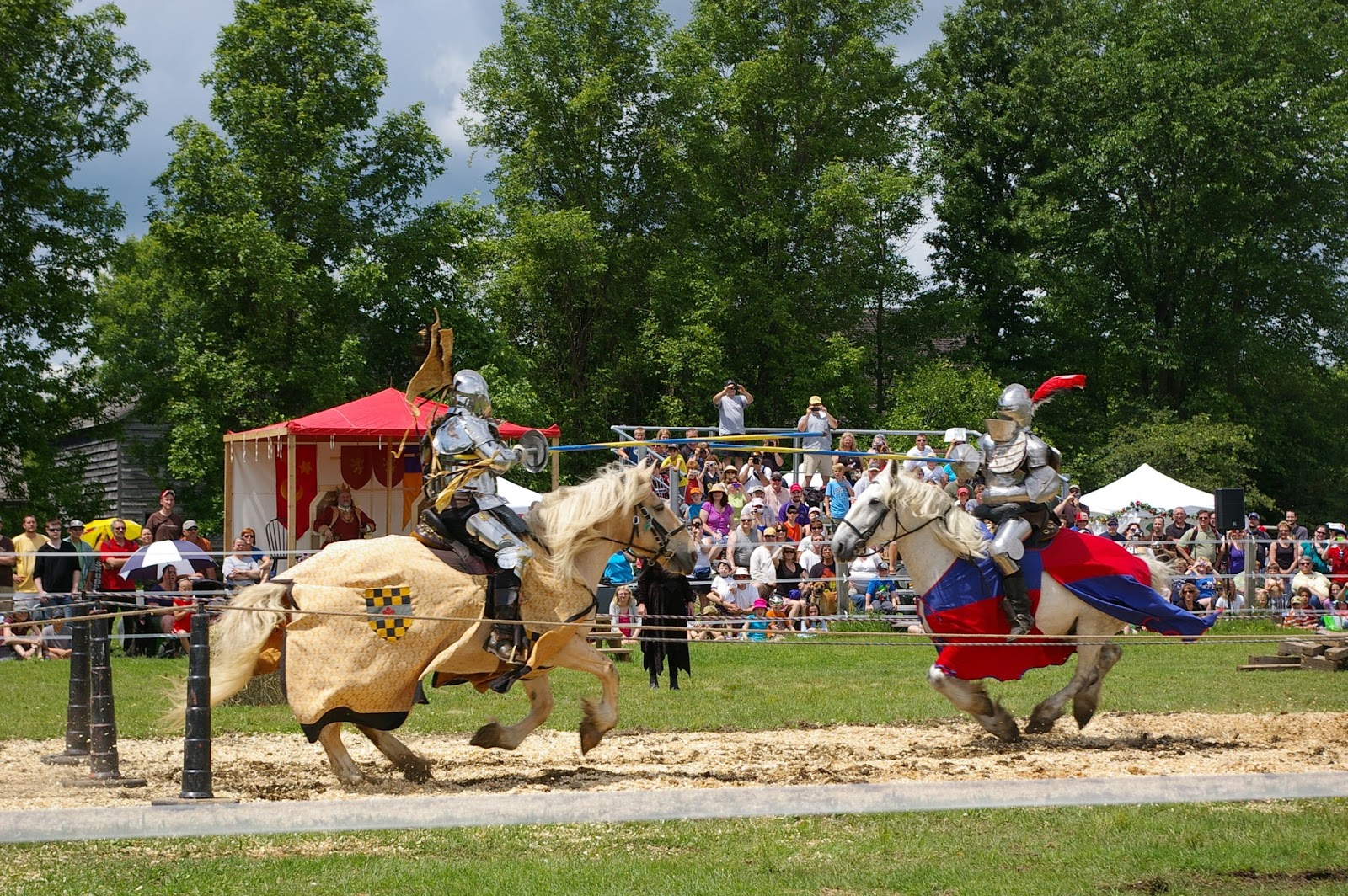 Victoria here – I was at a medieval knights festival a couple of summers ago and took this shot of the jousting tournament. It shows the 2 knights on horseback, the King's pavillion and the "locals" watching the event.