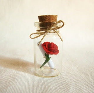 GiveawayHandmade red rose in a bottle (scene from book) with scrolled tied message: The Rest of My Life. Plus, one other handmade item: ceramic flower pendant.