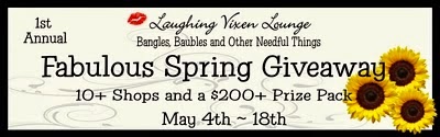 Spring is here and it's time for a big giveaway from Laughing Vixen Lounge. 11 shops have come together to create one amazing Prize Pack ($280+) full of Jewelry, Perfume, Clothing, Vintage and much more! Many of the shops offer items perfect for any book lover along with lots of other unique, handcrafted and custom designs.
