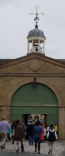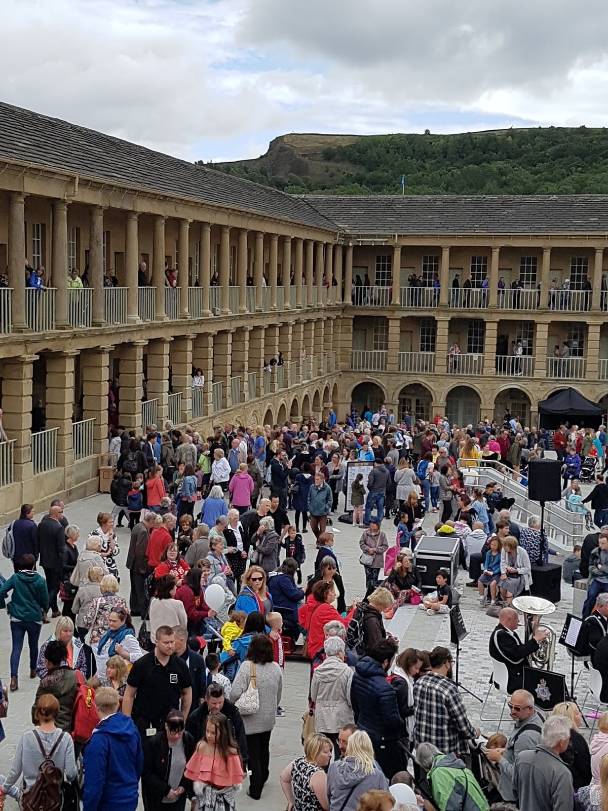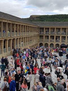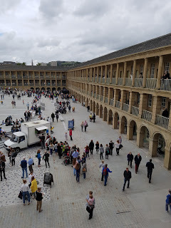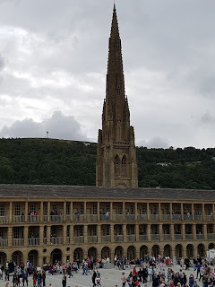 I always feel when I see this view of 'dark satanic mills'. The church spire is outside the hall but the dark hillside behind always seems to be foreboding. The same spire also messes with the scale of the Piece Hall. If you look at the size of the people the true scale is made more clear.