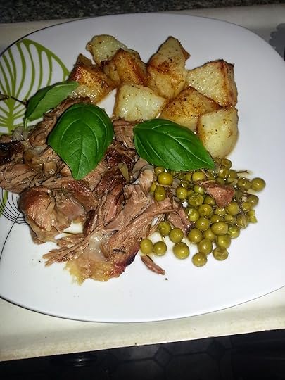 The full recipe is on the appropriate TAB at the top of this page. Apart from being very easy to prepare it is unusual in that there isn't a stock involved just three-quarters of a bottle of Chardonnay and a couple of tablespoons of honey which gives the meat a sweet tang. I served this with roast potatoes, peas and a bay leaf garnish.