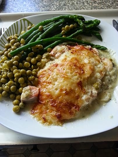 In with the smoked haddock and cod, I added large cooked and peeled prawns, finely chopped and fried onion, frozen peas, and hard boiled egg. For the potato topping I mashed the potato with creme fraiche, more onion and Gruyère cheese with some extra Gruyère grated on top. The pie I then served with sautéed asparagus and if I say so myself, it was delicious.