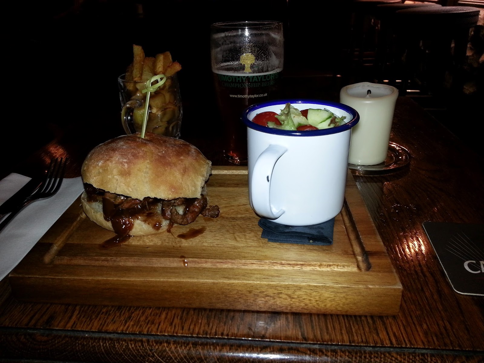 I felt rather self-conscious taking the photograph and so rather snatched at the view instead of taking my time hence the not great finish. However, you can see the presentation ideas. The salad is in an enamelled mug, the sandwich was served on a wooden platter, the triple cooked chips are in a half pint mug at the back of the sandwich. Irrespective of what you think of the presentation in comparison with the previous owners, it is innovative. The food was delicious by the way.