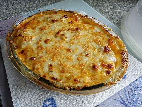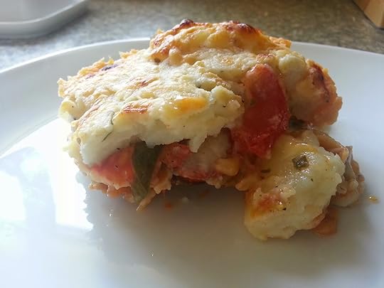 On the plate the layer of tomato, basil and potato is more visible as is the cheese sauce. I served it with garden peas but any green vegetable would go well.