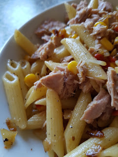 1 tin tuna in spring watersweetcorn1/2 red pepper, finely chopped1/2 green pepper, finely chopped2 spring onions, choppedpenne pastaolive oil and balsamic vinegar for a dressingsalt and pepper to taste