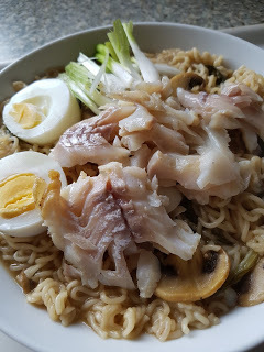 There are a least a couple of ways that you can produce a ramen dish. You can use the noodles in stir fry or in soups. The latter may be pork, chicken or fish based but in this busy world preparing the base can take a long time. The soup base is cooked over many hours using bones, shells etc and adding onions, mushrooms, ginger and so on. When I have the time and some spare pig's trotters here we go. For this fish ramen I used a vegetable base made from spring onions, mushrooms, garlic, ginger, smoked sesame oil, light soy sauce and chard. For the topping I had a piece of smoked haddock, a hard boiled egg and some raw spring onions.