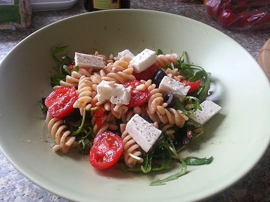 As the weather is warming up I was feeling the need for a salad and what better than Italian pasta salad. This is so easy. The only cooking is the pasta which needs cooking according to packet instructions if you are without a pasta maker. Then there is a blend of extra virgin olive oil, balsamic vinegar and a little sugar to make a simple dressing. Finally, a sharp knife to cut up vine ripened cherry tomatoes, black olives, then crumbled feta cheese and toasted pine nuts. This is served with rocket and is very tasty. Don't forget the pine nuts, they are essential.