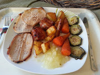 This is the same joint of pork, sliced and served with the balsamic roast vegetables. Again very easy. I mixed 1tbsp of balsamic vinegar with 2 of olive oil, salt and black pepper and roast at 175 Celsius for about 45 minutes. You could spice these up as well in any way that suits your palate.