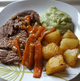 The meat is brisket and was very tasty. To ensure a moist joint I roasted the meat on a bed of onions and carrots after first rubbing olive oil into the meat and then seasoning with salt and ground black pepper.