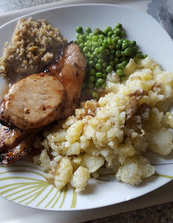 This week I was short of time and needed to put a meal on the table so I chose pork steaks, crushed new potatoes and peas with sage and onion seasoning. Rather than saying that this meal takes a specific amount of time I will say what is possible.