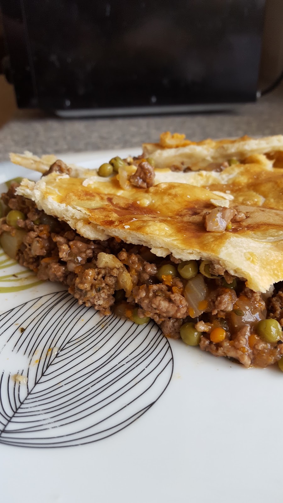 1. Heat the oil in a pan and fry off the mince. When browned add the onion and stir together for 2 - 3 minutes until the onion clarifies.2. Stir in the garlic, herbs and tomato puree and season. Stir in the flour to promote the thickening of the gravy.3. Pour in the bottle of brown ale and bring to the boil.4. Once simmering add the peas and potatoes and keep simmering for 20 minutes.5. I cheat because irrespective of how easy making pastry is supposed to be I just end up covered in flour and with pastry that is full of holes. Roll out the pastry so that it is large enough to cover your pie dish.6. Preheat the oven to 200 degrees C.7. Pour the meat filling into your ovenproof pie dish and cover with the pastry. Cut 2 or 3 slits in the pastry to allow the steam to escape and brush with beaten egg. Cook for 25 - 30 minutes.