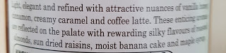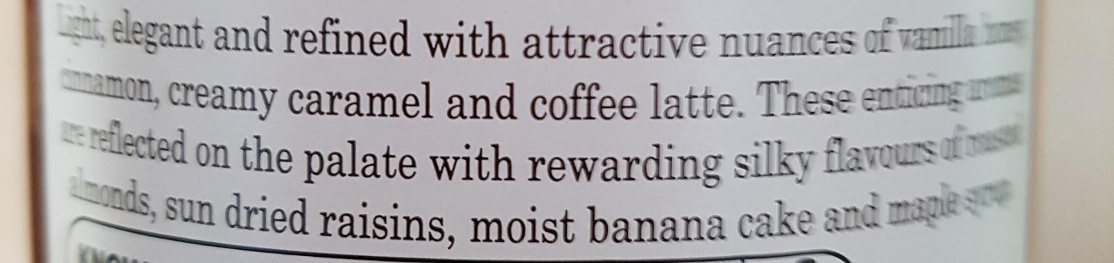 This is a positive flavour fest with vanilla, caramel, latte, almonds, sun dried raisins, banana cake and maple syrup. The person writing this label indulged in a rich range of adjectives also. The banana cake is 'moist', the caramel 'creamy' and the flavours are 'silky'. A fine, persuasive list of attributes to what is a brand of whisky. I must say that in a decent scotch I can usually manage the vanilla and caramel flavours but the rest require a deal of creative imagining.