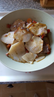 So I considered the recipe and was thinking I don't like THAT and Idon't like THIS so decided to call it the This/That Stew and made suitably Atkinson friendly adjustments.Out went the celery and in came a red pepper, it was supposed to be green but the supermarket weren't selling any loose green peppers so I bought a red one. Instead of lamb I found some lean cut beef and with the addition of carrots and onion had the basis of the stew. Of course I still had the recipe in front of me and finished it off with a layer of potato on the top.Like all stews it is bunged in the oven and cooked slowly for hours, except for the last half hour when the lid of the casserole is removed, butter dotted on the potatoes and allowed to finish with a nice crusty top.Now of course you can design your own family friendly stew. Mine would have suited many members of the family as there was no garlic, not too many herbs (I did use parsley), and no alcohol. You could use all or some of those, and use different vegetables. The tastiness and suitability for your loved ones is up to you and when complete there is only one person to blame if it isn't popular!