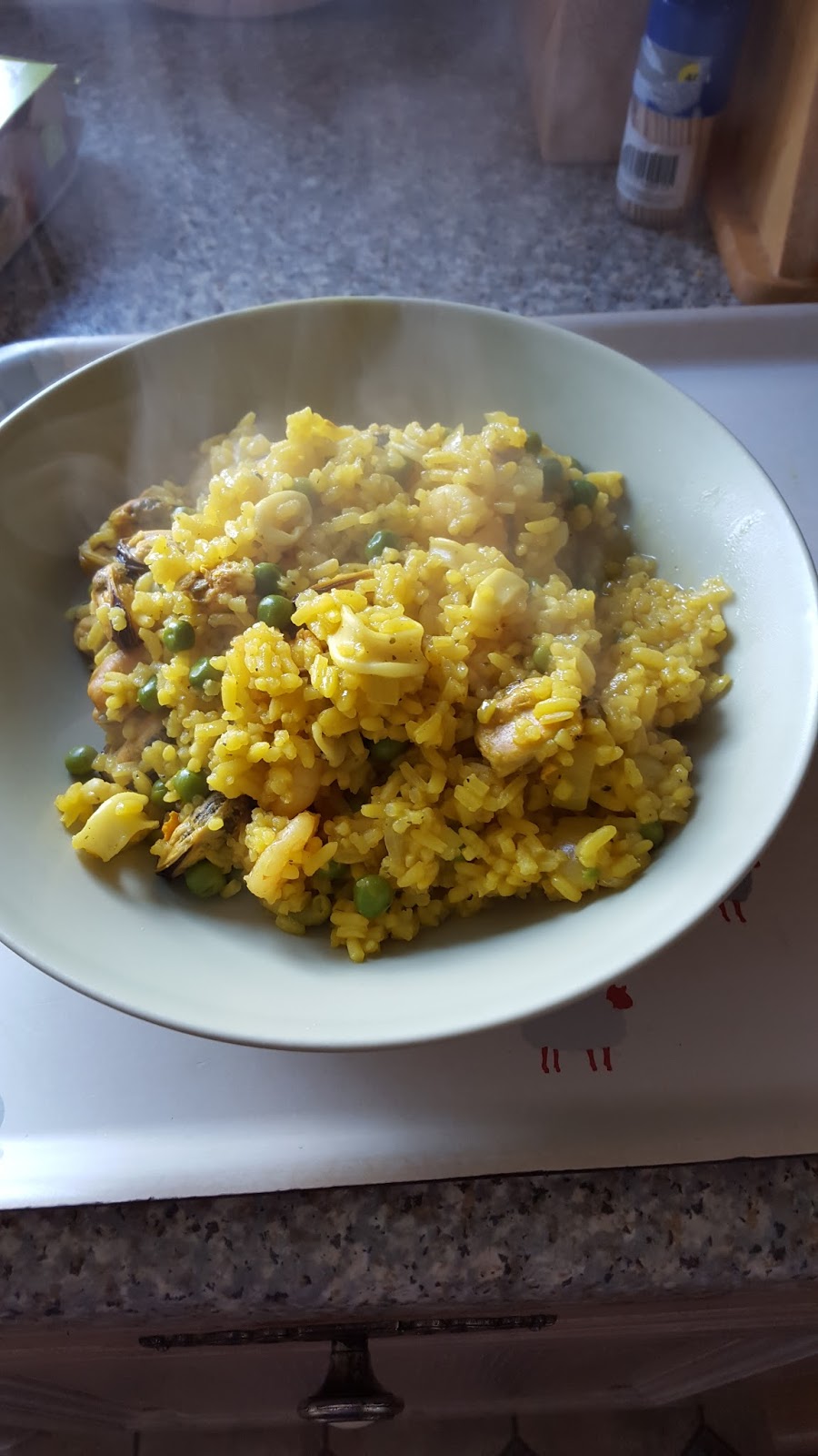 I am not up to the standards of a friend who has won prizes for his paella in Spain the native country of the dish, so this is a simple version that anyone could produce.The main difference to cooking rice and stirring seafood into the end result is that the rice is cooked in vegetable or fish stock with onions, garlic and seasoning. The seafood was not caught by one's own fair hand but bought from the supermarket as a mixed fish package usable in fish pies as well as paella.The end result is very tasty.
