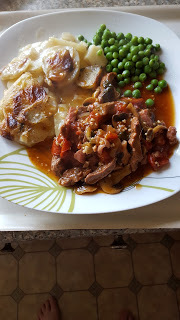 It was almost a 'make do' weekend because of external commitments and as I stick to fish on Friday the sea food paella was inevitable. I bought steak to cover meals over the weekend and for the beginning of the week so there isn't a lot to show, steak and salad, steak and new potatoes and peas BUT - I decided to use the last two steaks, which wasn't the best cut, in a strogonoff.