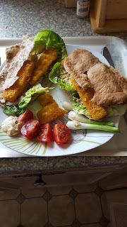 As a child mother would occasionally serve up a fish finger sandwich with plenty of tomato ketchup for tea, that's the meal eaten around 5pm! I've spoken to many people who have declared their love for this strange combination. In some ways it is a little like the Yorkshire 'fish butty' with fish and bread soused in ketchup, but instead of batter you have breadcrumbs.This week's version may seem posh but it isn't really it probably has more links with the post beer session supper as it even has the spiciness often craved after a good night in the pub. The spiciness comes from the mayonnaise and is so very easy to reproduce. Half a teaspoon of curry powder, a squeeze of lemon juice, stirred into a couple of tablespoons of mayonnaise. I even used a 'light' version so that it wasn't as calorific!I haven't put a separate recipe on the TAB because this is a meal more about assembly than cooking skills or special ingredients. Of course there is a recipe for making your own fish fingers but for the most part that is putting a coating of seasoned breadcrumbs on chunks of firm white fish with a little beaten egg. There is of course still good old Captain Birdseye!