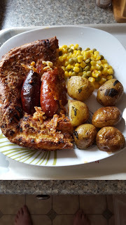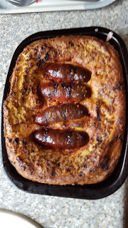 Last week I had a few chorizo sausages, some new potatoes and sweetcorn with peas. I felt that was rather bland and then discovered an egg, plain flour and milk - naturally toad in the hole. It was quite an easy dish to produce, roast the sausages in the hot oven for ten minutes before pouring over the batter, then cook for around 30 minutes.