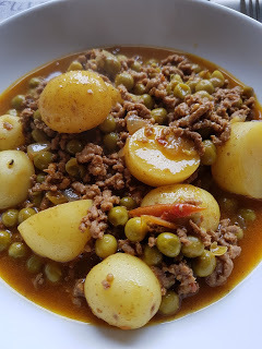 Marsala - mustard seeds, tumeric, garam marsala, cumin, chilli flakes, ginger, curry powder and butter.500g beef mince1 onion, chopped1 tbsp tomato puree5 cherry tomatoes, halvedtin of garden peasbaby new potatoes, halved