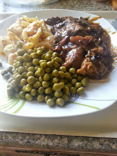 I'm not going to insult you chefs out there by producing a recipe for what is a simple enough meal but will explain what I did that may trigger an idea or two.I understand why some people would dislike liver, as a child I didn't enjoy it either, but I think that was because it was over- cooked. If it is in the pan too long what is a very compact meat becomes even more dense which is probably because the moisture is cooked out of it and at that point you could use it to sole your shoes. The lamb's liver on the plate above was as tender as chicken and that was sealed on the outside for a couple of minutes then cooked with the bacon, onions and gravy for seven or eight minutes. The meat wasn't bloody but was quite soft and flavoursome without being aggressively so. Of course, other types of liver, pig's and beef, can be much stronger.The meat was served up with dauphinoise potatoes and peas, so the costing for the meal was in the region of £1.13p. The liver cost £1-59 and I had 3 meals from it, the other two being stroganoff. (See below)