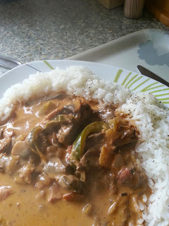 The stroganoff was probably even less expensive as the rice is £1/ packet and that makes at least 10 servings. There is a green pepper, a couple of mushrooms and a small onion plus 1/3 a small pot of double cream. Costing - £1.05/serving.