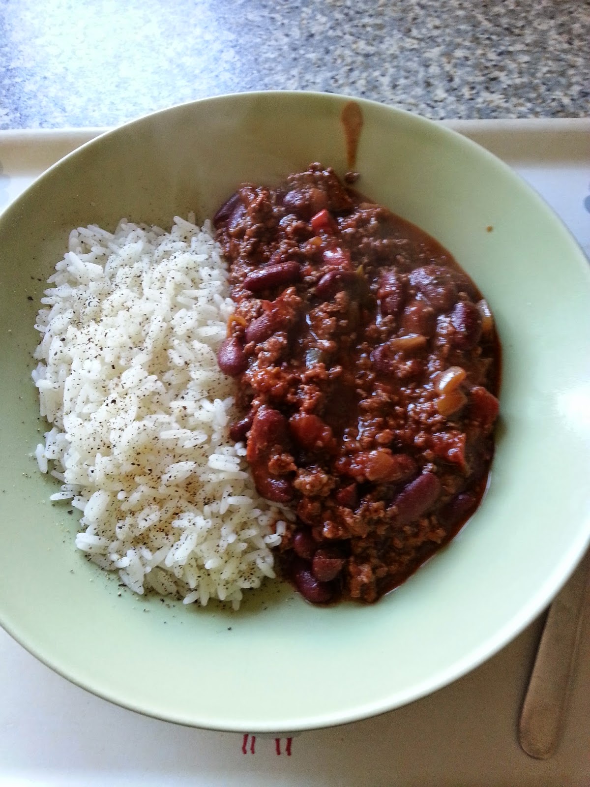 This is a bowl of comfort food for me but I was browsing recipes last week and came across this version which was slightly different and quite luxurious. There were three variations to the standard chilli.1. The meat wasn't just minced beef but it was a mixture of braising steak cut into chunks and minced beef.2. There was a third of a bar of 70% cocoa solid chocolate in there.3. The dish was cooked in a casserole in the oven for a couple of hours to ensure the braising steak was tenderised.