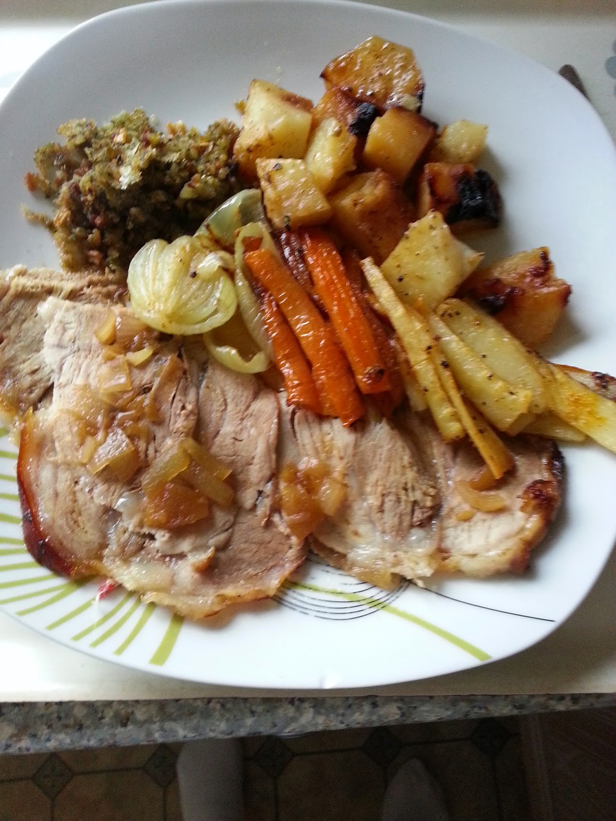 I had planned a very different meal for the weekend but my frugal gene was fully active while in the supermarket last week. I spotted quite a decent sized, boned leg of pork for £3.60 and to give some idea of how large it has already served three roast dinners and will go towards a curry and sandwiches as the week progresses. So very reasonable.When I roasted the pork I did so on a bed of sliced onion rings and a similarly treated dessert apple with a drop of water. I have done this before and it produces the most delicious gravy, the savoury saltiness offset by the sweetness of the apple. To make the gravy, remove the roasted meat from the roasting tin and pour in whatever liquid you wish to deglaze the pan, dry white wine or cider would be perfect. Add a little gravy browning and flour and heat on the stove stirring frequently. The apple all but disappears but the flavour is unmistakeable. If you don't want to use alcohol just add hot water. You still produce a very flavoursome apple onion gravy.