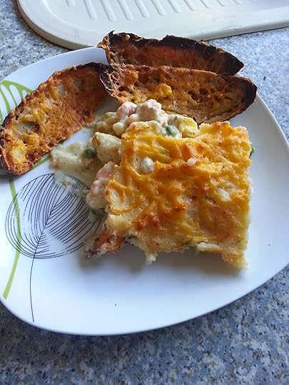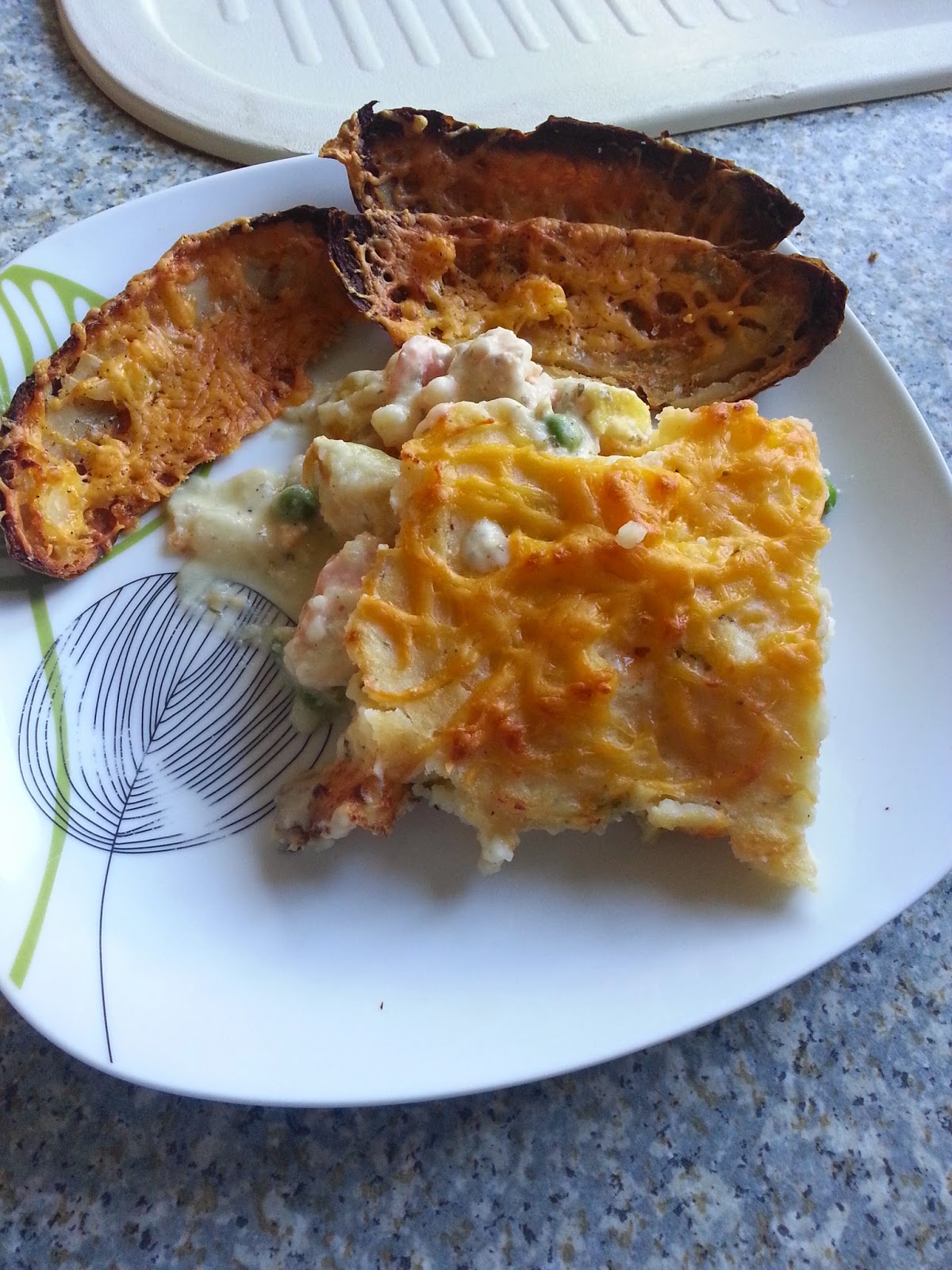 The idea was to use baked potato as the mash topping for the fish pie. It's not new and produces a mash with firmer consistency but in the past I've thrown skins away. However, I saw a TV chef just season and sprinkle some cheese on the skins and bake them to produce a tasty addition to a meal or in fact when cold a snack or party food. They take about ten minutes in an hot oven.
