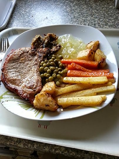 So Saturday and Sunday was as the above photograph but then the chops were accompanied with special egg fried rice. The chops I actually oven baked with a little seasoning on a bed of apple slices. The juices left after the roasting made a sweet dressing. With something like chops there are a range of dressings such as teriyaki with which you can marinade the meat before roasting or grilling.