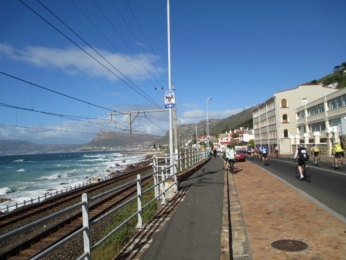 Having ridden the Argus before, as though through muscle memory, I recalled well the easy, relatively flat cruise from there back into Capetown and the finish. As we rode along, I mentioned to Curtis how Chapman hadn’t seemed as hard going as I recalled. How I’d remembered a stretch where we seemed to be riding almost straight up, with lots of wobbling, pedaling almost to a standstill, and spectators giving riders pushes to help them up. “That wasn’t Chappie,” Curtis said. “That hill you're remembering is the hill that comes after Chappie . . . ”