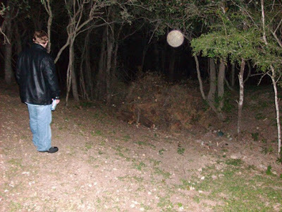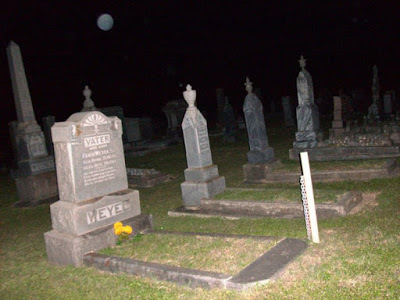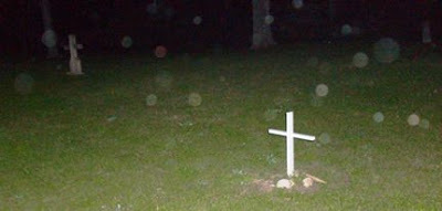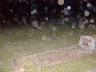 The image with a mother-load of orbs was interesting. I had clicked a picture right before that one and there was nothing. Then, I invited whoever was there to come stand before me for a picture. I did this to kind of freak out my friend, Kip, who is a complete non-believer of ghosts. He was not happy with the result....nor was he happy when I showed him the other pic below of a very large glowing orb following him at the edge of the cemetery.