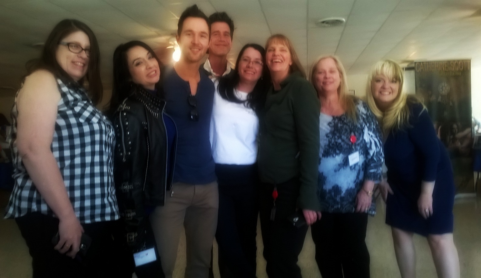 L to R: Samantha Jacobey, Diane Rinella, cover model Devon Ryan, (photo bomb by the husband of author Anne Conley), Kelly Cozzone, Aubree Lane, Teri Riggs, and Jami Brumfield