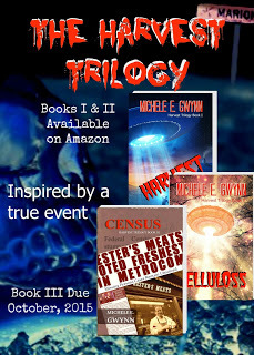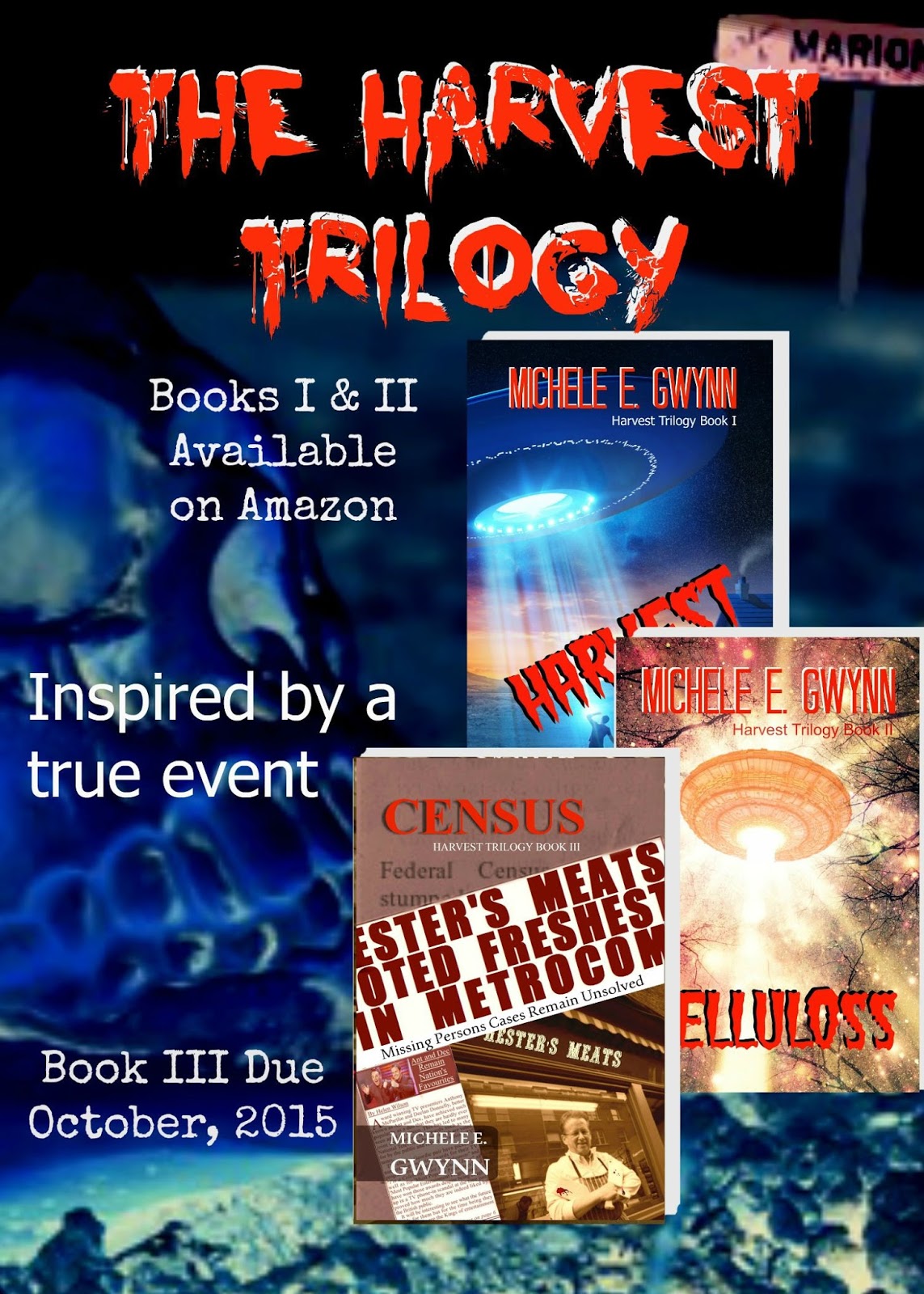 First came Harvest, a short story inspired by a true event that happened to Michele E. Gwynn in 1995, and finally reported to MUFON in 2011(described in the introduction of book one). A small town in Oklahoma is invaded overnight by beings not of this world, and they have a message for us all - CHANGE! And they mean it! Nearly every resident disappears leaving behind a bloody stain, a horrific shadow of their humanity. Feeling like the lone survivor to the apocalypse, Dave Forrester must solve the mystery, and fight to save the ones he loves.
