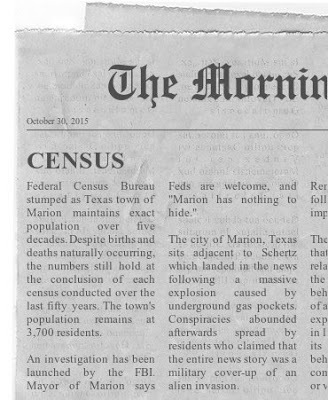 Finally, Census - The story continues in the next town over. Marion, Texas, population 3,700, is so small, if you blink driving through, you'll miss it. One area business owner is awarded 'Tastiest Meats in Town' by the Chamber of Commerce. John Hester's family-owned meat market is a staple in the region. Respected by the locals, he is above reproach. When he befriends new resident, retired 9/11 firefighter, Jack Callaghan, things get weird. Stranger still are the disappearing residents, unsolved cold cases Callaghan discovers as he and his wife try to settle in. When they begin receiving veiled threats from the Reverend Harcourt Cane warning them to leave, Jack must find a way to protect himself and his wife, and help the FBI solve the mystery of the fifty-years of Census that never budges...