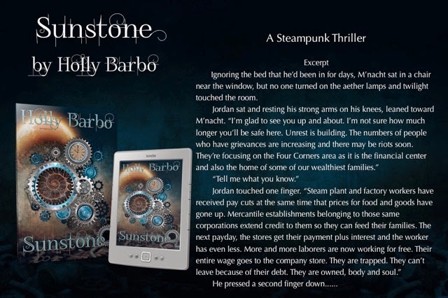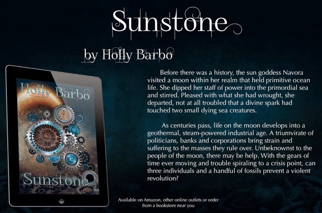 I am raving mid-book over Sunstone, the new political steampunk thriller from author Holly Barbo. My review will be forthcoming, but for now, let me say that I'm coming up for air to share this amazing story with you all so you can join me in reading it! Barbo can build alien worlds so magical, beautiful, and chock full of details that she invents new words to describe everything. That's how awesome she is! So do yourself the biggest favor in the world and check it out.