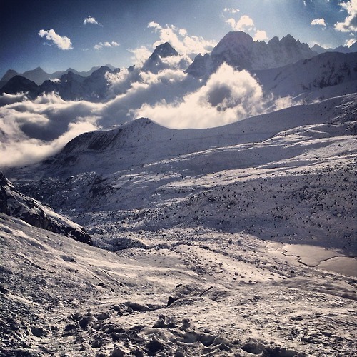 Chasing November sunset tracks off Cho La at 18,000’ with 5 feet of new snow. Khumbu region, Nepal