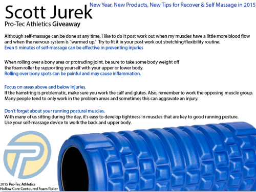Self-massage can be an effective way to prevent and treat running injuries and there are a lot of great ways to incorporate it into your routine. Here are my tips. And to celebrate 2015, Pro-Tec Athletics is giving away some of their new products. Enter the giveaway on their Facebook page through Tuesday. Good luck and an injury-free 2015 to all of you!