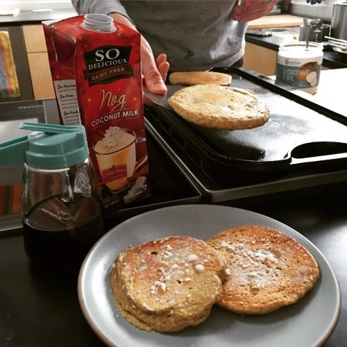 Pumpkin Pancake Sunday! Yesterday I tried a twist on my 8 Grain Strawberry Pancake recipe from “Eat and Run” page 79. Instead of strawberries I subbed 1 cup of freshly roasted pumpkin (my last squash from the fall farmers market), added 3/4 cup of flour, and for the non dairy milk I used one of my holiday favorites, So Delicious Coconut Nog. I also blended the batter in a Vitamix to purée the pumpkin. When the nog is out of season, one teaspoon of pumpkin pie spice with any non dairy milk will work nicely.