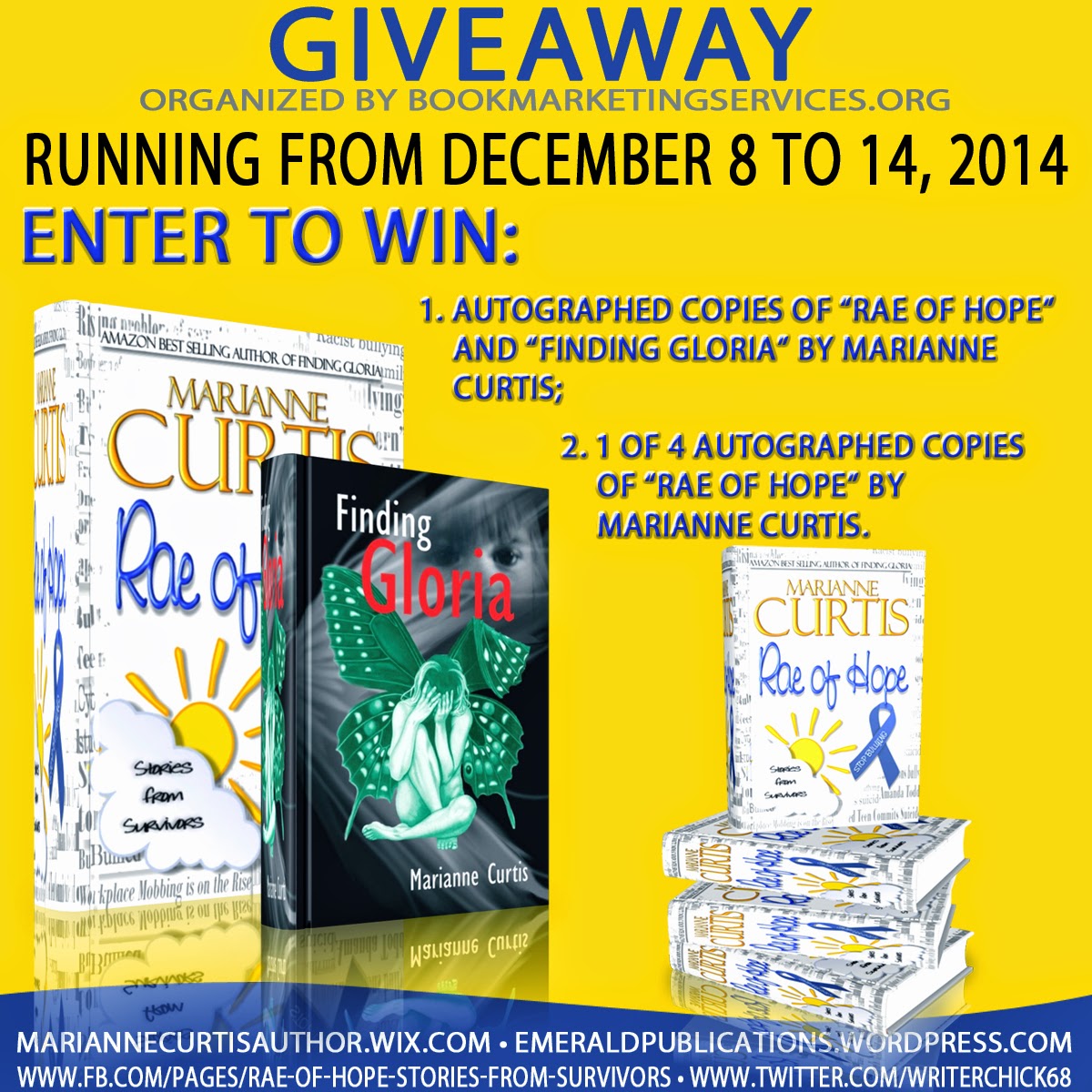 GiveawayFirst prize: Autographed copies of Rae of Hope and Finding Gloria by Marianne CurtisSecond prize: 1 of 4 autographed copies of Rae of Hope by Marianne Curtis