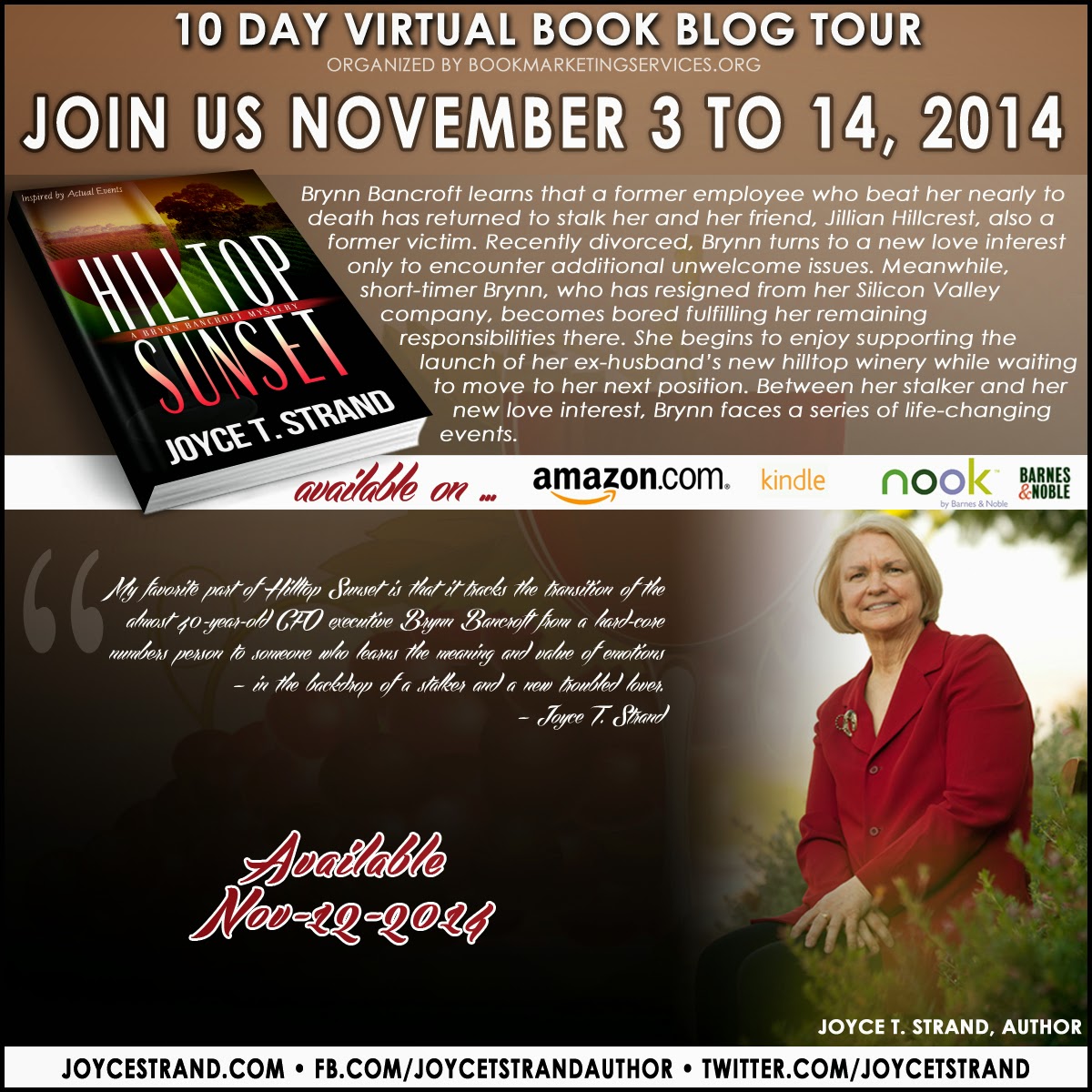 HILLTOP SUNSET, a mystery set in wine country pitting financial exec—my boss—Brynn Bancroft against a determined stalker, a troubled love interest, and career clashes. Like all Joyce T. Strand mysteries, HILLTOP SUNSET is drawn from a real California case.
