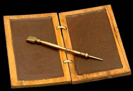 It’s the local equivalent of the iPad, made of wood with a re-usable wax layer. It measures ca 20 cm x 12 cm (when closed). Incl. bronze stylus.