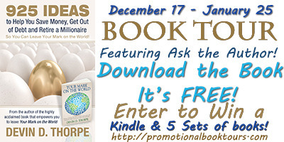 The tour prize is an Amazon Kindle (GC equivalent) and 5 winners of Mark of the World and 925 Ideas to Help You Save Money, Get Out of Debt and Retire A Millionaire So You Can Leave Your Mark on the World. Everyone can download 925 ideas for FREE from Smashwords! Fill out the for below to enter! Open Into for Digital and US for Print.