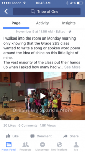 Day One…I dashed from room to room interviewing all the students. What words did they use to describe their school, their class, teacher and friends? I asked them for personal stories of how someone had made their life better. I wrote everything down.