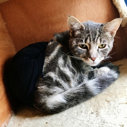 Early last week, Olivia Murderpaws was finally spayed. The surgery is common, of course, but serious, with a ten-day recovery period and stitches, so she was supposed to wear the cone of shame. To no one’s surprise, she figured out how to get out of it in record time. Suzanne went out and bought a doughnut type cone, and Olivia managed to escape from that one, too. Oh, well, no cone for her.