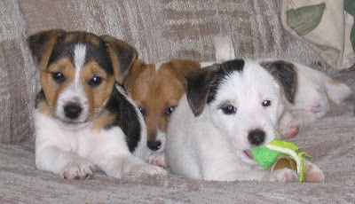 Oh, and the real reason I decided to write something today--it's Zelda's 9th birthday. Nine years old! I hate that number, although I like it better than double digits. Here she is with her siblings, eight years and several months ago. Of course she has a ball in her mouth.